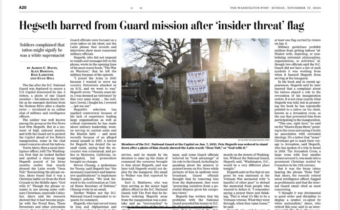 The Hegseth story is interesting because it offers such a clear picture of the nuances that distinguish Christian Nationalism from true faith. When the naval intelligence officer observed Hegseth’s tattoo on social media he alerted military leaders that Hegseth could pose an insider threat if deployed with his unit to Washington DC following the January 6, insurrection. When the future nominee for Secretary of Defense was told to stand down and not report for duty, he was incensed.